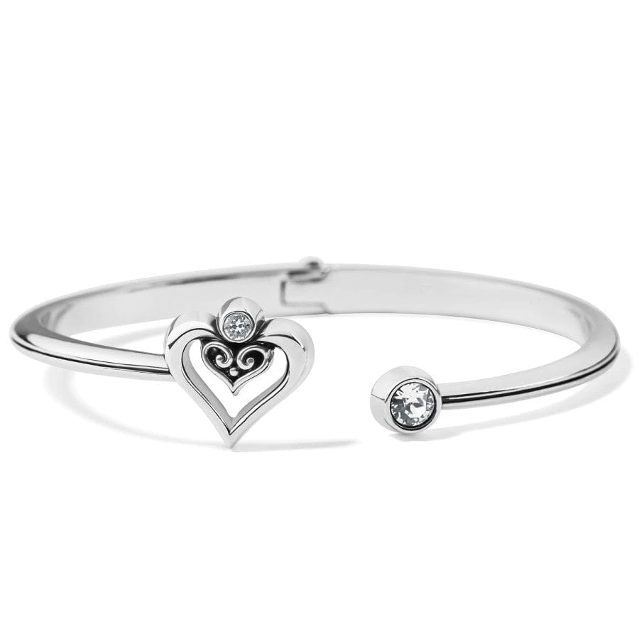 A heart within a heart, capped with a sparkling hand-set crystal, is the perfect adornment for this easy-to-wear bangle.