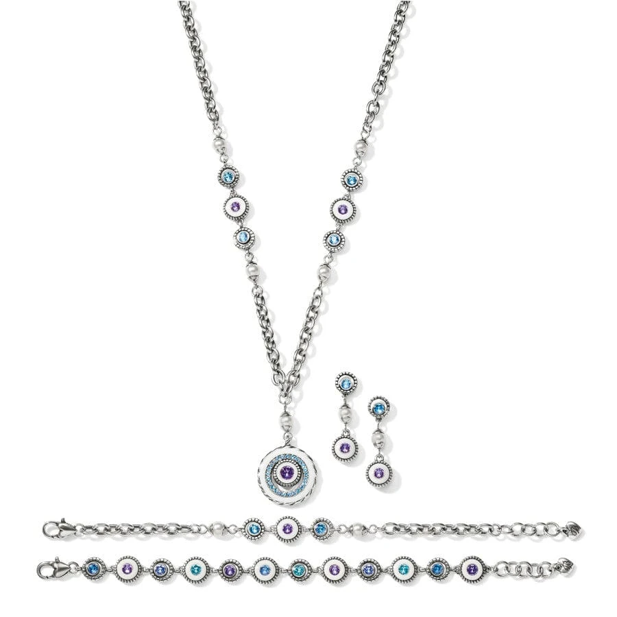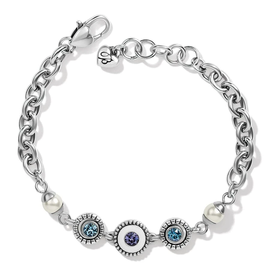 This bracelet is adorned with a white pearl and crystal accents of tanzanite and aqua on a chunky chain – adding just the right touch of modernity to the timeless look.